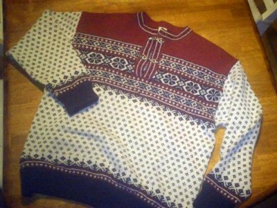 Mycket är det som ska fixas och donas innan vi kommer iväg. Själv har jag fyndat på loppis, en fin ylletröja för en tjuga! De va inte dåligt de eller tycker ja! Så nu har jag tillbringat kvällen med att laga alla hål som fanns på'n.. Å de va många vill ja lova, men jäklar va fin an vart sen!